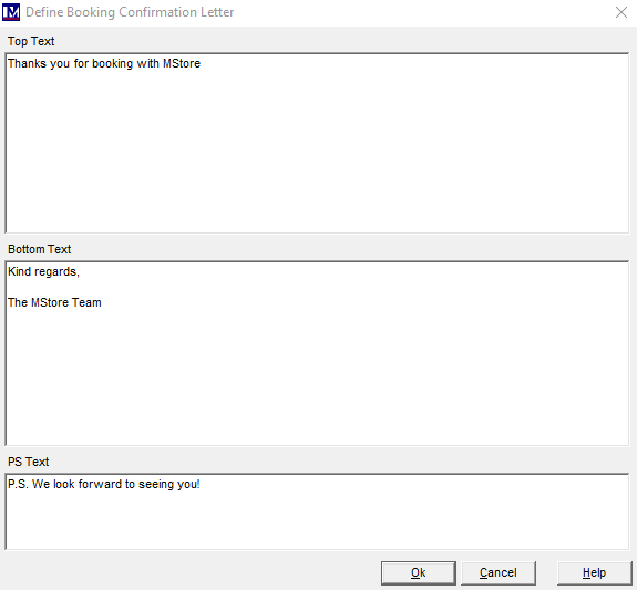 This is where you will be able to change the various text fields that can be found on the booking confirmation letter. Once you are done, click OK