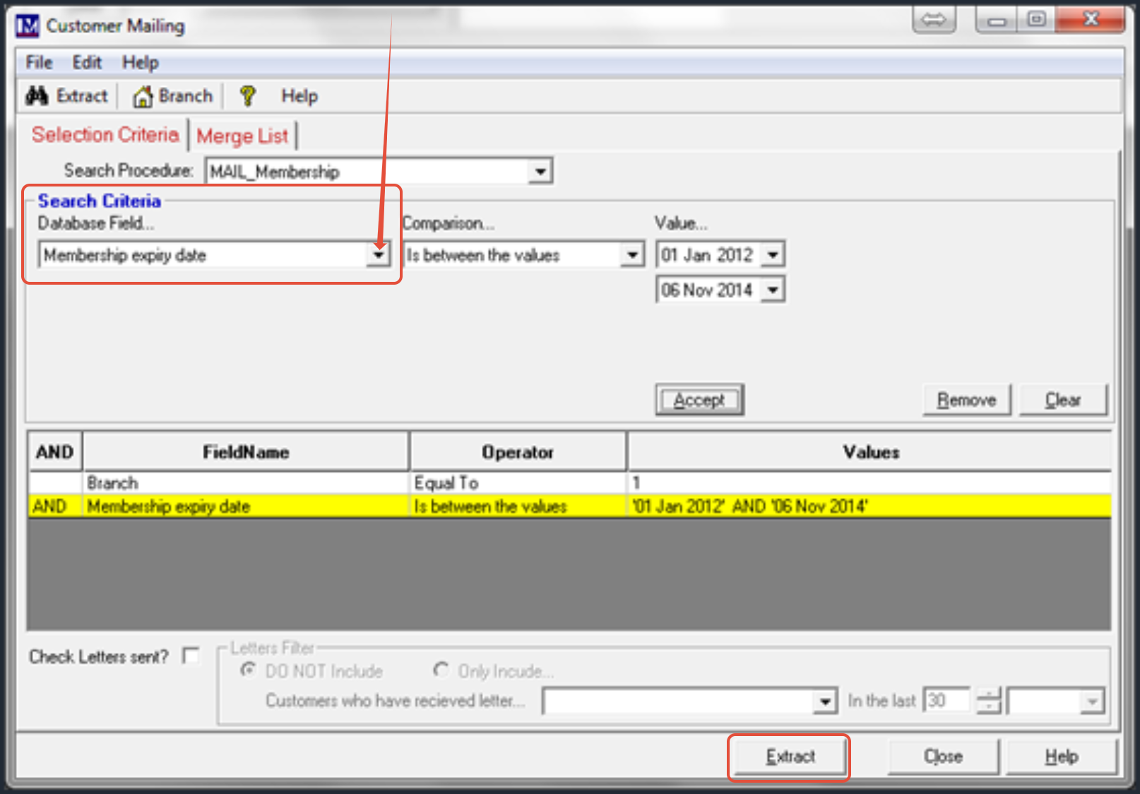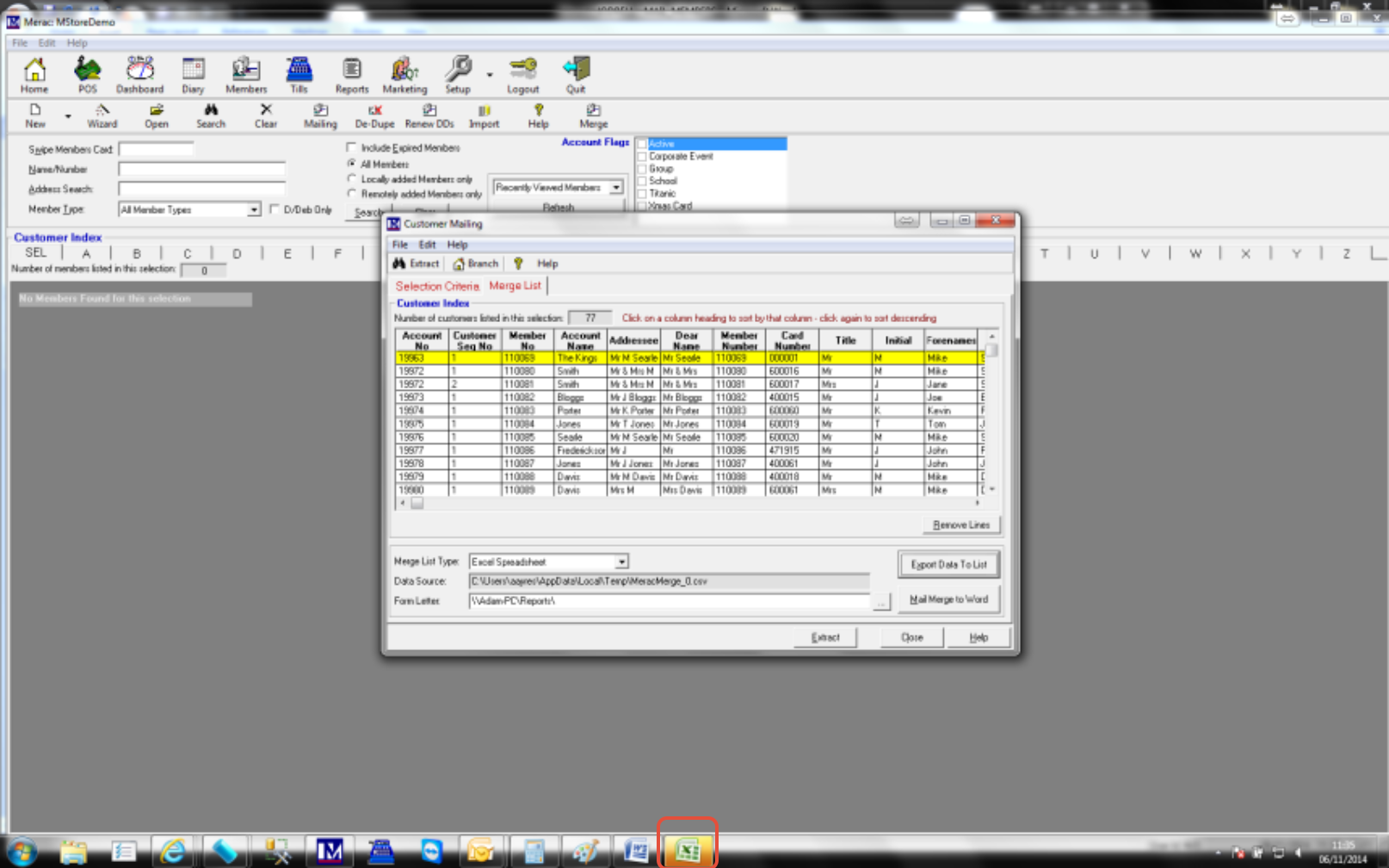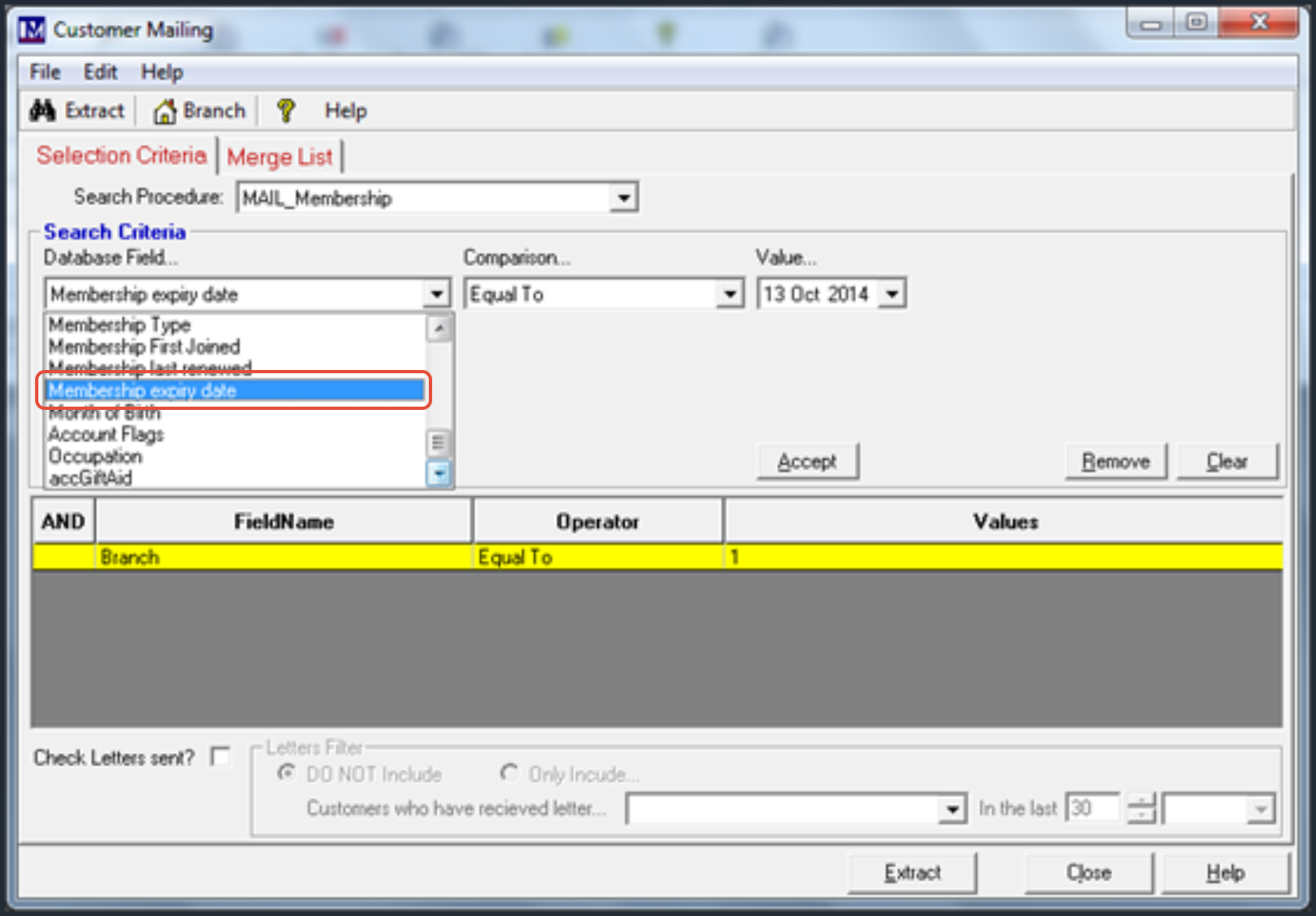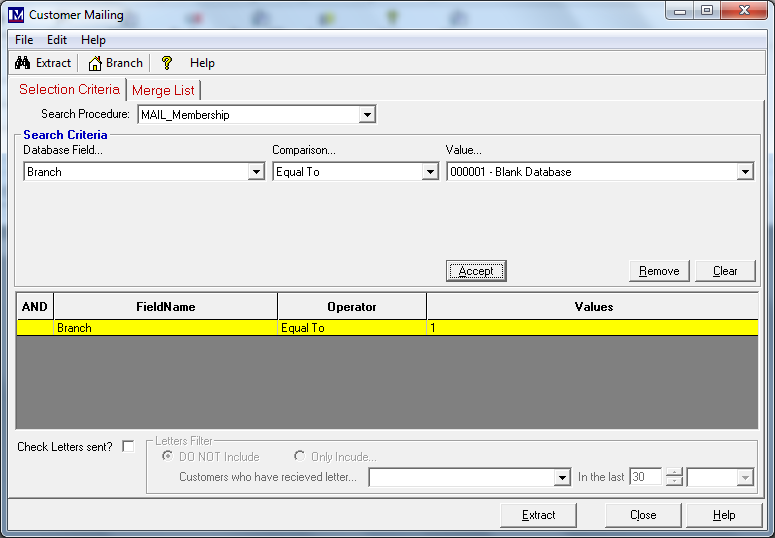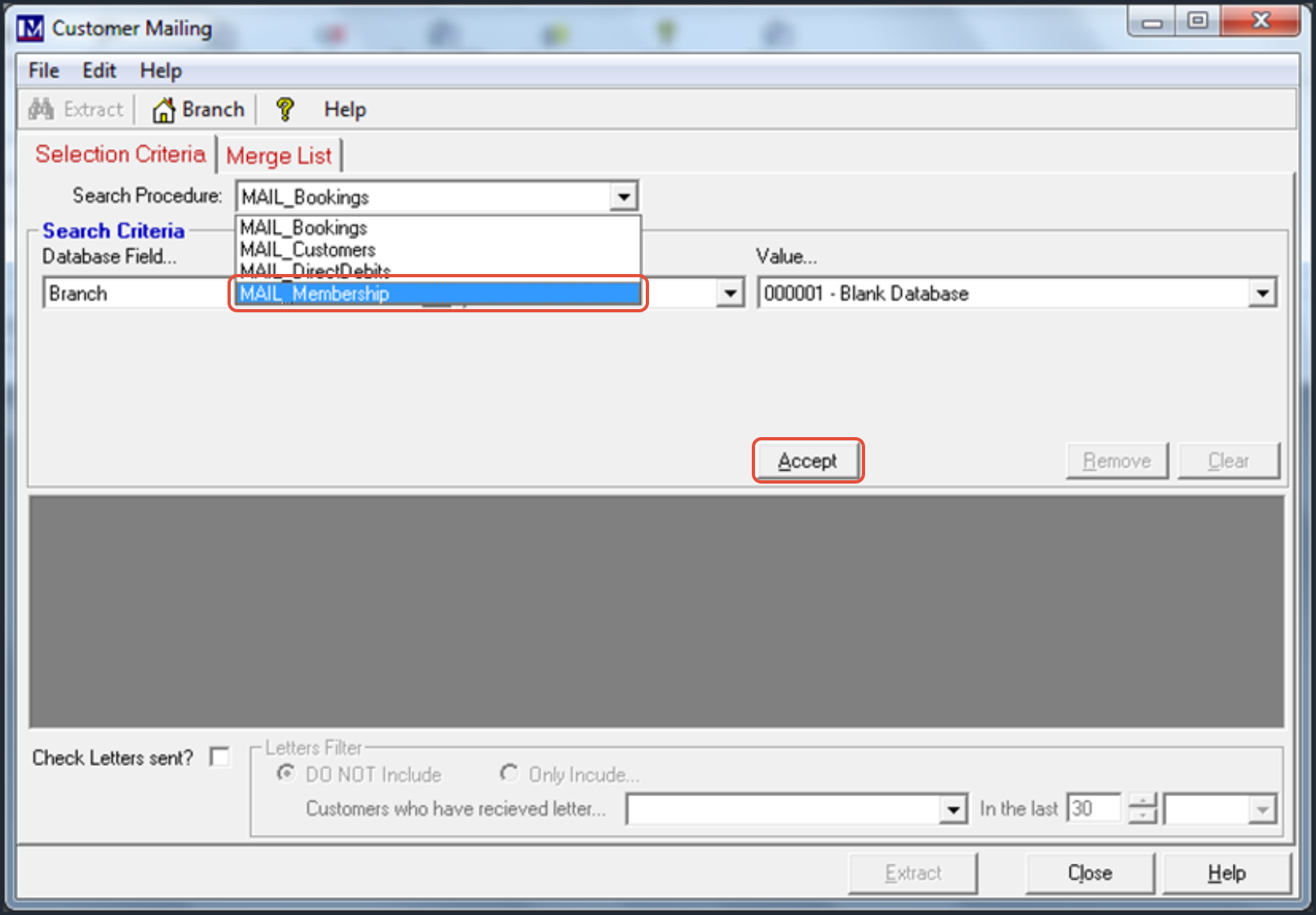 The following is a step by step example on how to use the ‘Member Mailing’ option within the ‘Merac’ back office software. This option enables you to create your own data extracts from your member’s database which you can either (i) extract as a Microsoft Excel spread sheet, or (ii) mail merge to Microsoft Word.