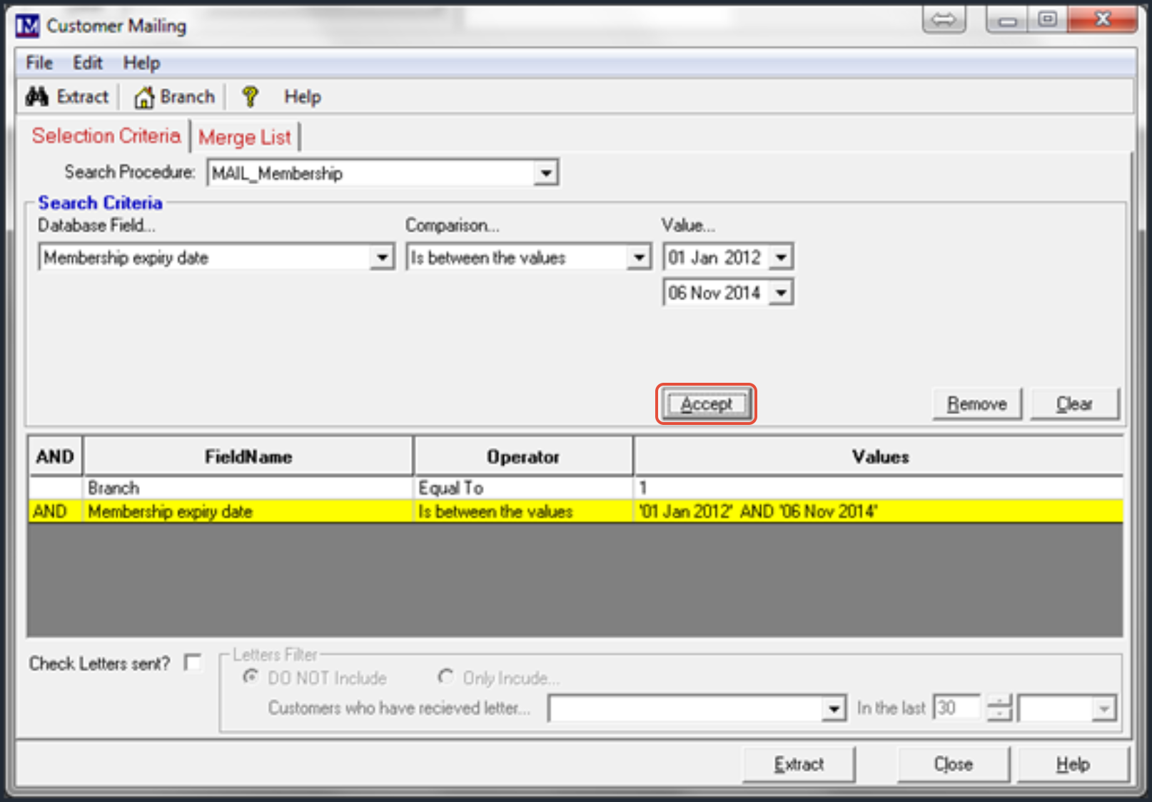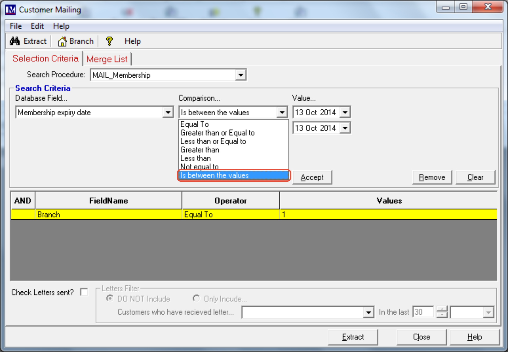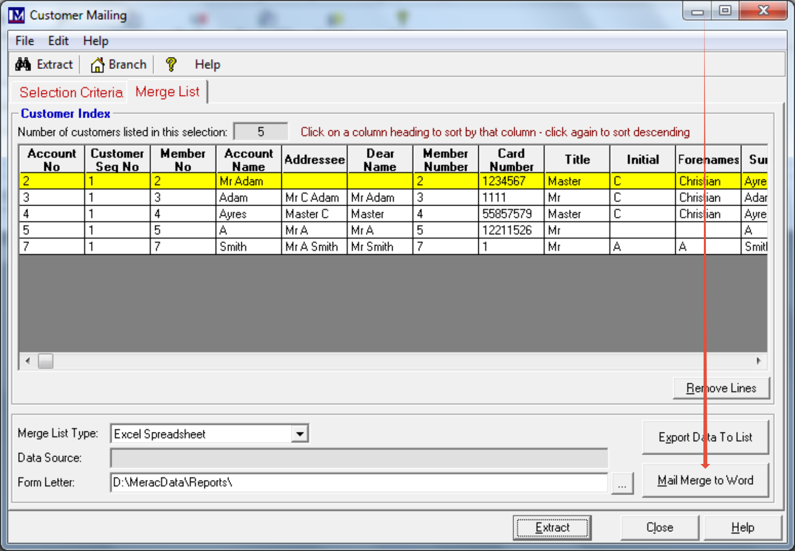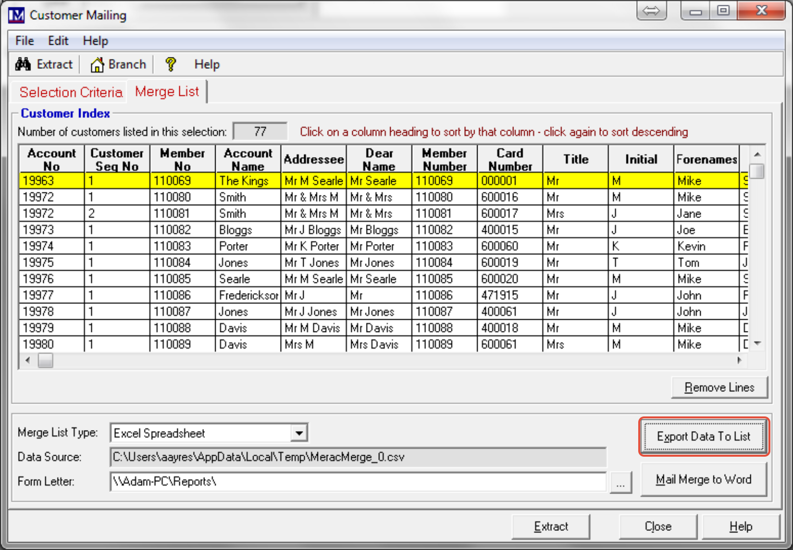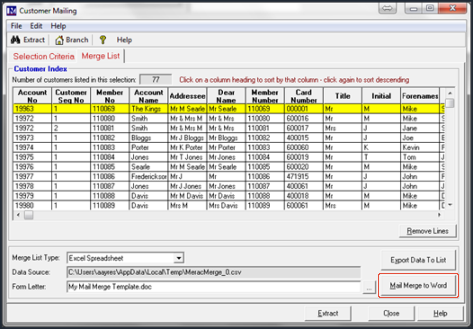 The following is a step by step example on how to use the ‘Member Mailing’ option within the ‘Merac’ back office software. This option enables you to create your own data extracts from your member’s database which you can either (i) extract as a Microsoft Excel spread sheet, or (ii) mail merge to Microsoft Word.
