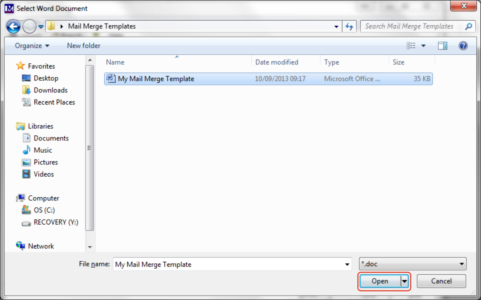 Navigate to the required folder and click on the required Microsoft Word mail merge template.