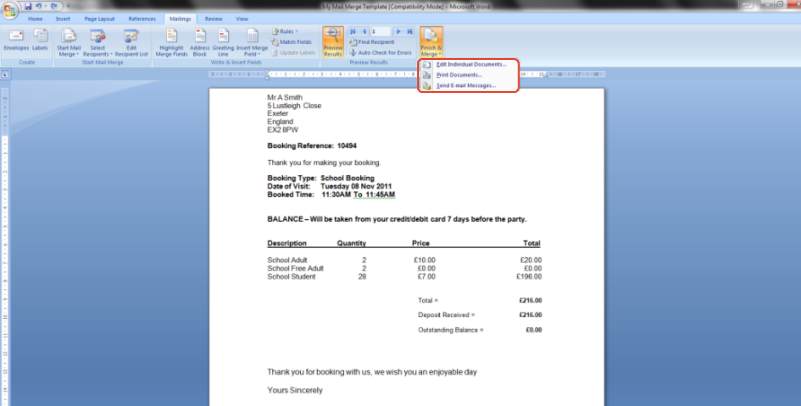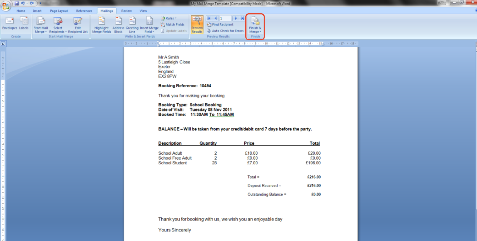 Next click on ‘Finish and Merge’ to proceed with the mail merge.