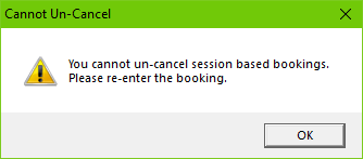 If you have followed the Un-Cancel Non-Session Bookings Knowledge Base article, but are receiving the below error message, this is because you are trying to un-cancel a session based booking.