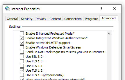 Click on the ‘Advanced’ tab and ensure that TLS 1.2 is enabled: