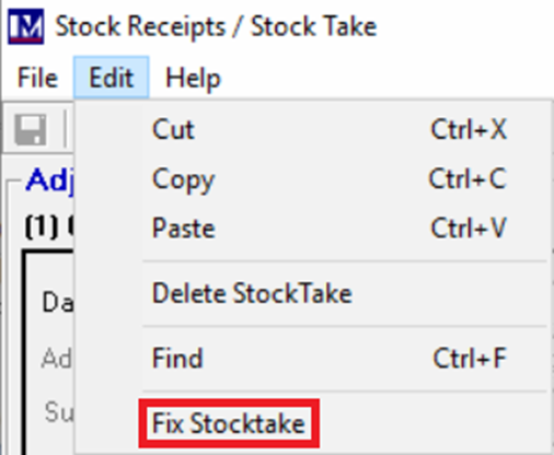If you would like to run this for all of your stock items in your system; you can click Edit in the top-left of the Stock Take screen. Then click Fix Stocktake to recalculate stock movements for all items since the last stock take. This will take a considerable amount of time, so don't be alarmed if this takes 5-10 minutes and shows as though the screen is not responding.