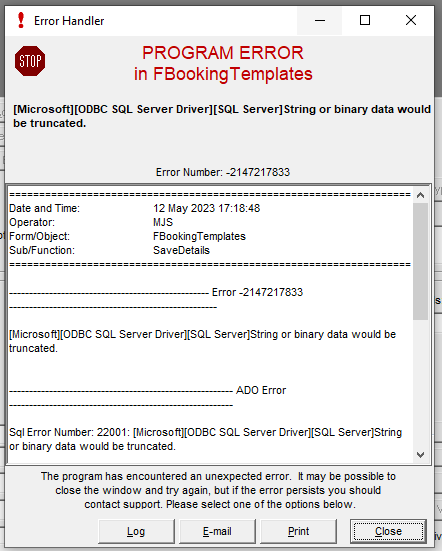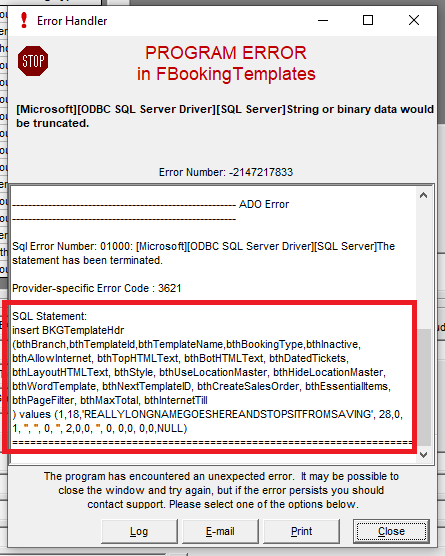 If you are unsure which field is causing the error please contact the support team and send over the SQL error shown further down in the error box: