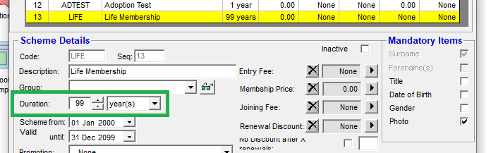 Solution: Set the membership duration to match the valid to and from date length. In this case 99 years.