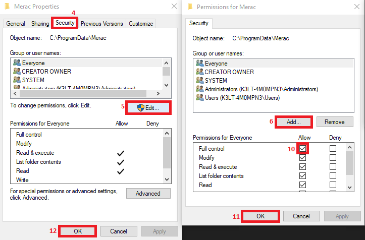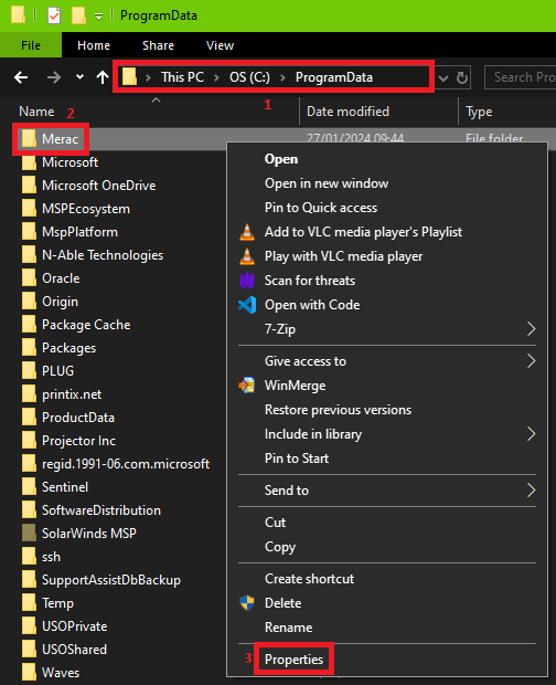 Right-click on the Merac folder (labelled 2 above), and select Properties (labelled 2 above).- Within the Properties window, click on the Security tab (labelled 4 below).