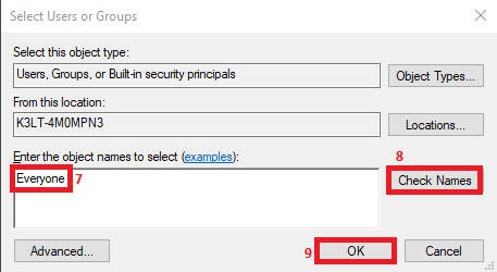 - Click Check Names (labelled 8 below), OK (labelled 9 below).
