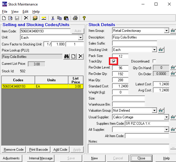 If stock movements are not being recorded for this 'Stock Item', it is likely that the tick box to the right of the text 'Track Qty:' is unticked. Click in the box so that it becomes ticked. The 'Save' button at the bottom of this screen can now be clicked to save the changes.
