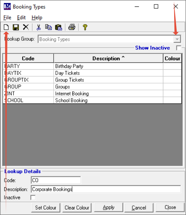 - Enter a ‘Code’ (e.g. CO) and the required ‘Description’ for the new ‘Lookup Item’ (e.g. Corporate Bookings).