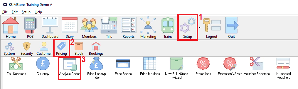 To set up ‘Analysis Codes’ please 1. click on Setup then 2. click Pricing then 3. double click Analysis Codes.