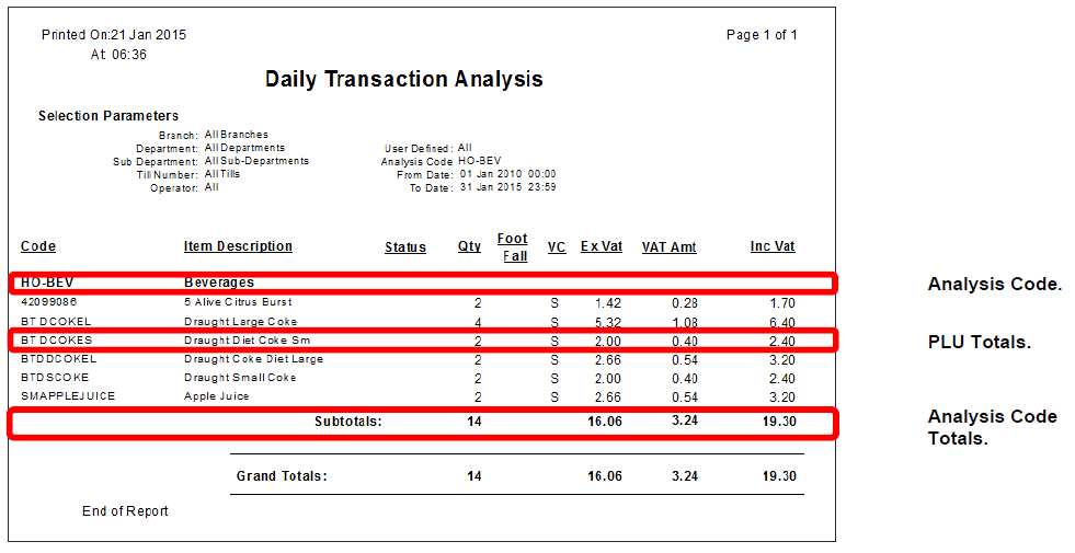 An example of a key report which uses the analysis code structure is the ‘Daily Transaction Analysis’ report. An extract of this report is shown below so you can see how the analysis code set up affects your reports. The below data for simplicity shows data for a single 'Analysis Code' and the breakdown of item (PLU) sales within that. However when you run a report it will typically be showing data for all the 'Analysis Codes' selected by using the report filters.