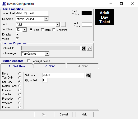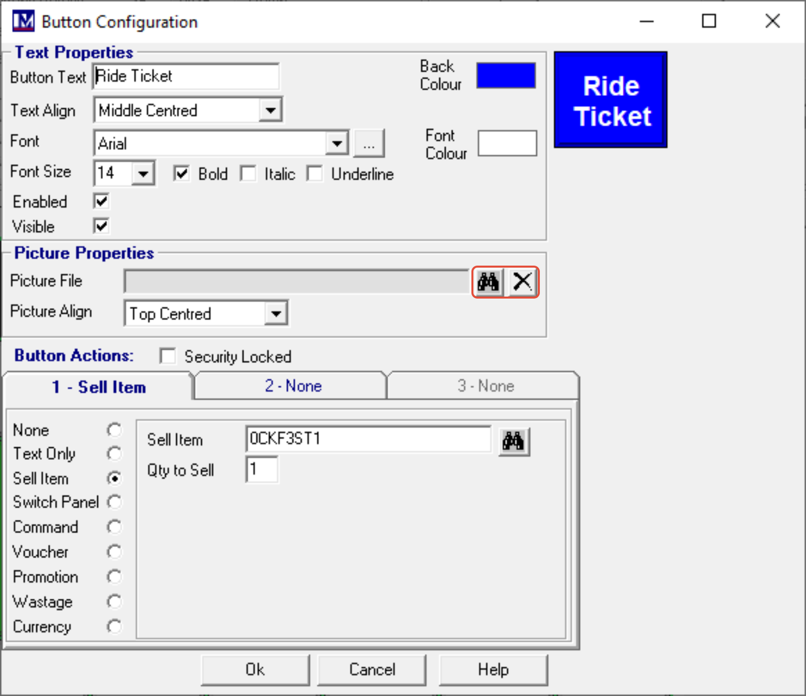 N.B. if you select the wrong image, or wish to remove the image from the button, then simply click on the ‘X’ button to the right of the ‘Picture File’ box to remove the image.