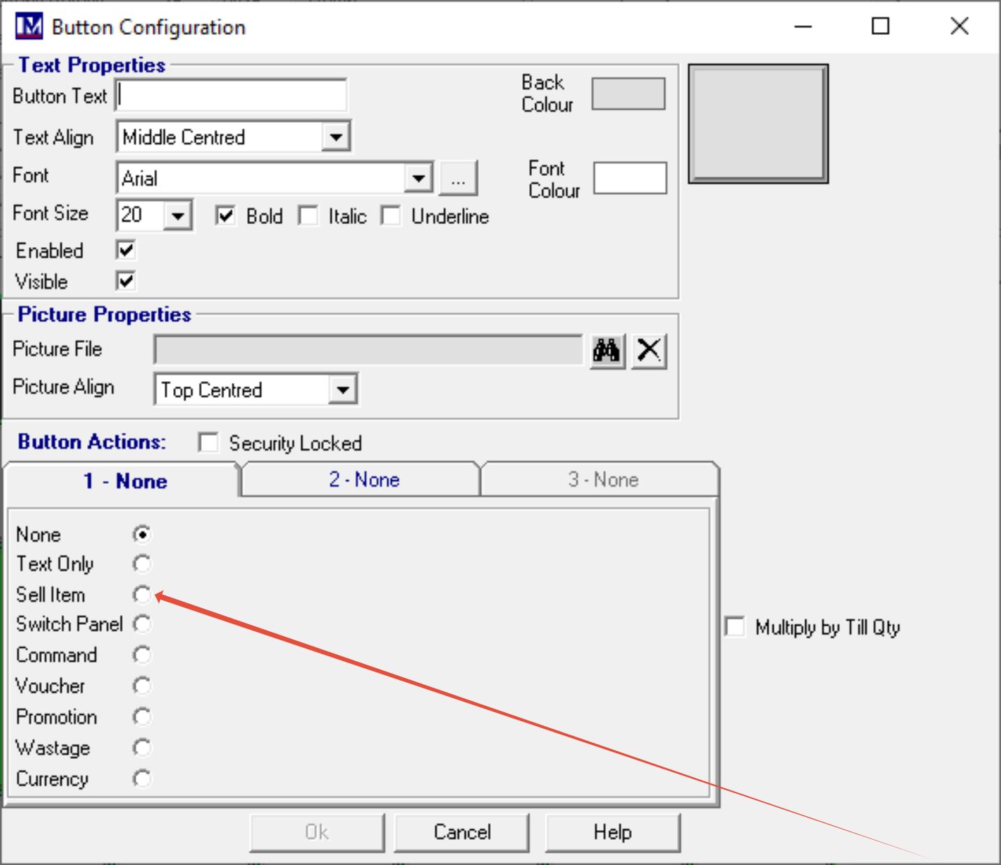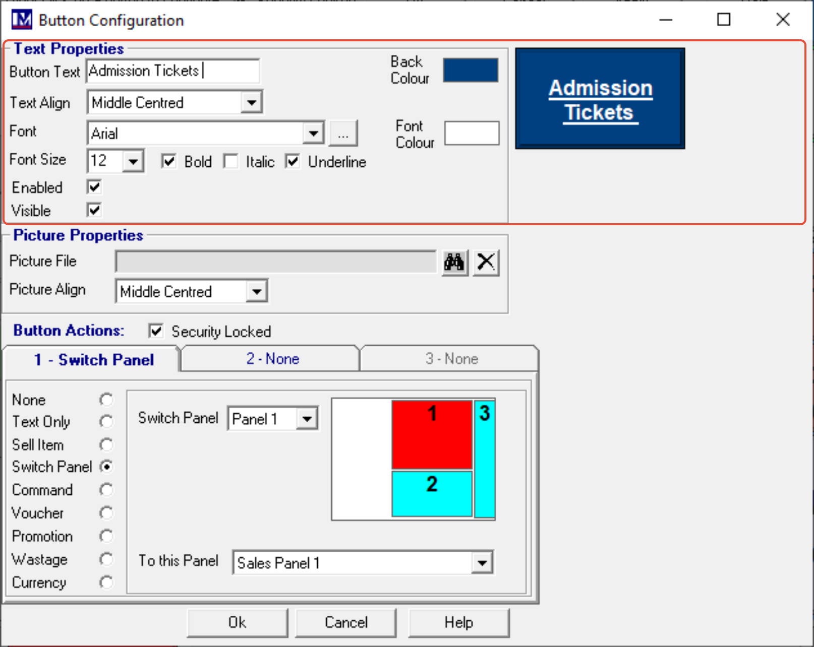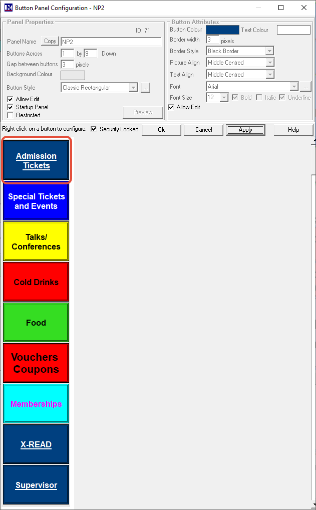 As before the ‘Button Panel Configuration’ screen appears, but you can see it is for the selected section of the till screen.