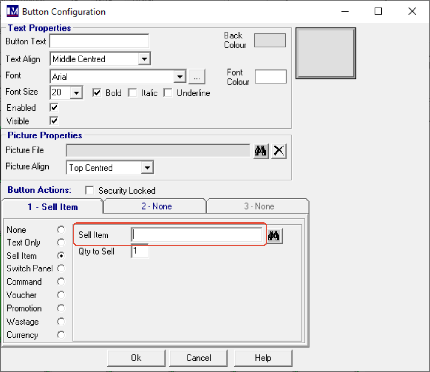 | Promotion: | If ‘Selected’ (coupon driven) promotions have been set-up, this is for assigning a button to a ‘Coupon’. |