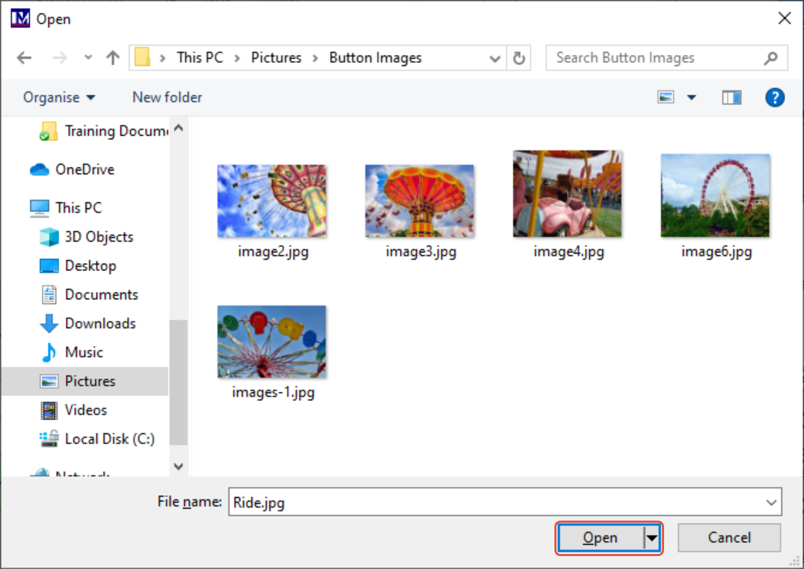 To assign an image file to a button, click on the binoculars to the right of the ‘Picture File’ box.