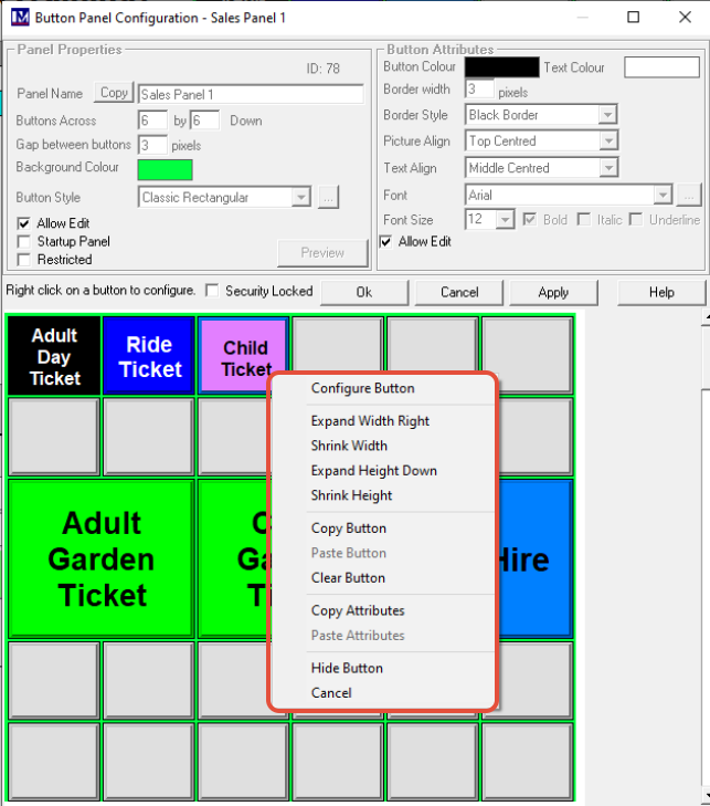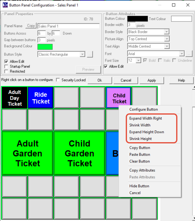In the ‘Button Panel Configuration’ screen the size of the buttons can also be amended. Please note the width of a button can only be expanded to the right and the height of a button can only be expanded downwards, so before doing this process make sure there is the required space around the specific button(s).