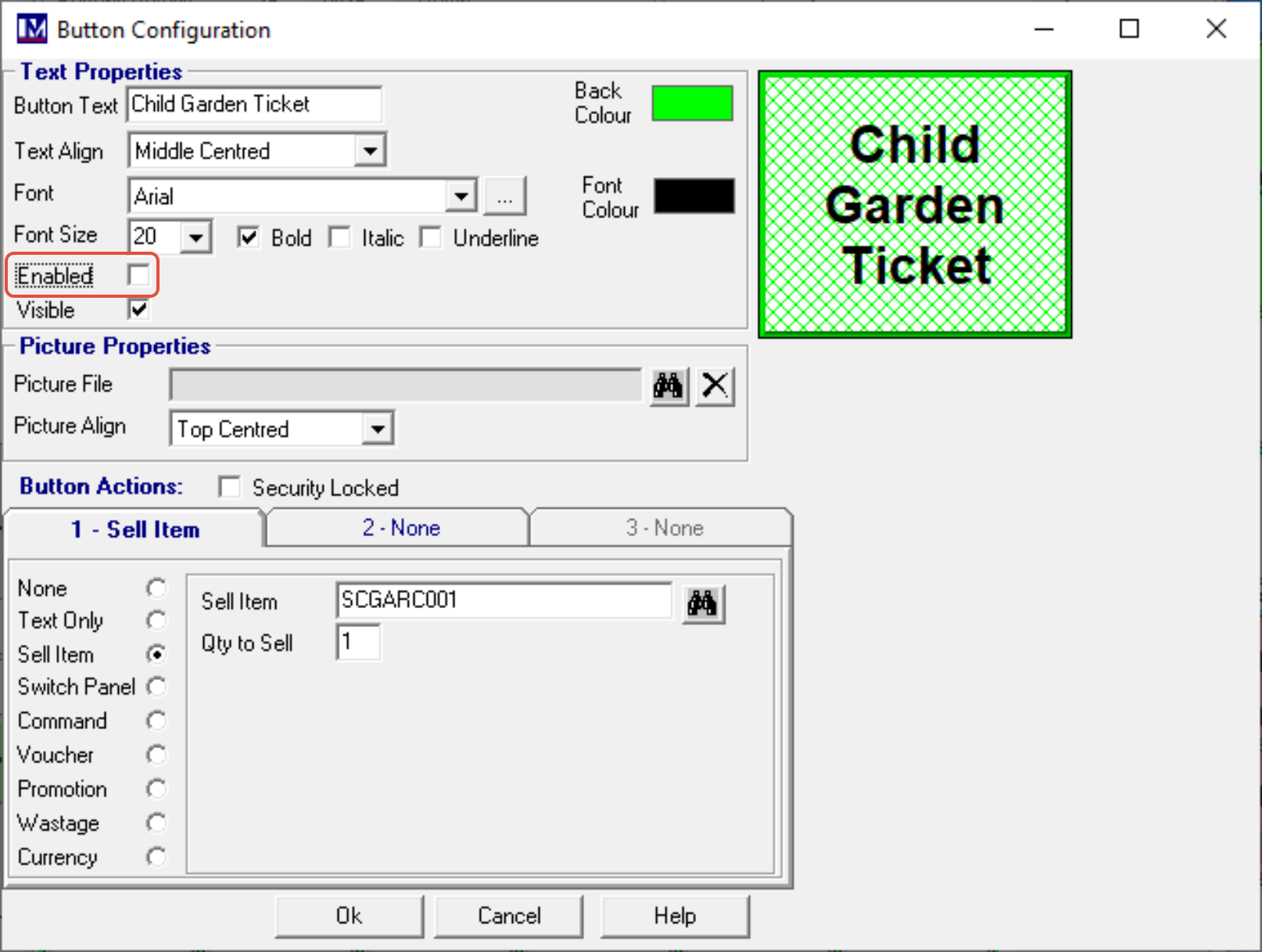 If required you can also disable a button, to do this untick the ‘Enable’ tick-box where shown.