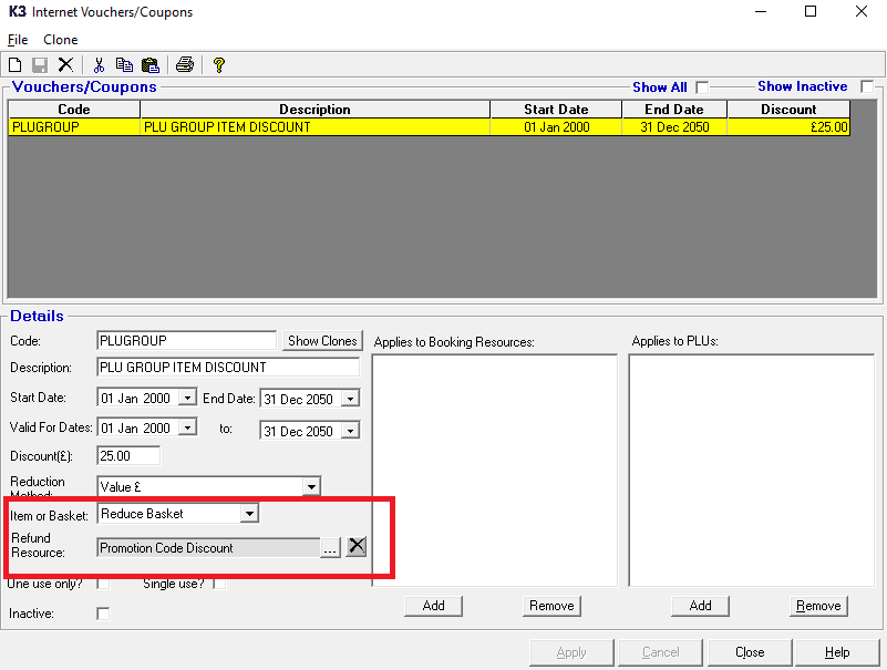 If you would like to discount PLU Group items on your website, you will need to setup an Internet Voucher that is Basket Reducing, with a Refund Resource set. This will add a separate line in the basket when recalling the booking, that involves the discount.