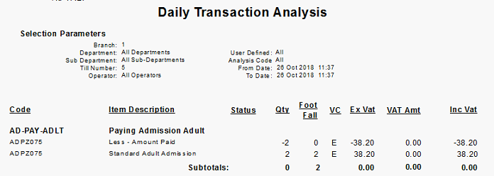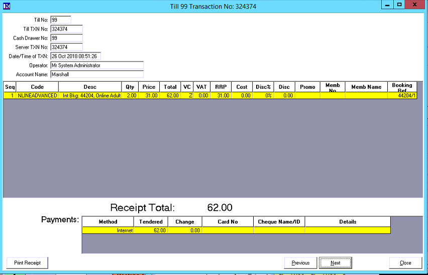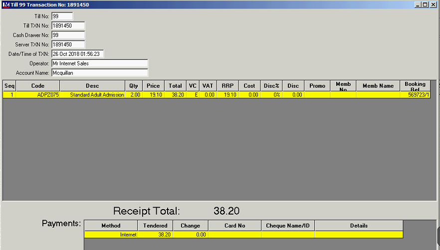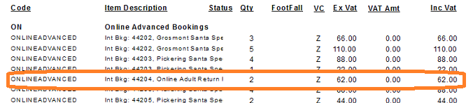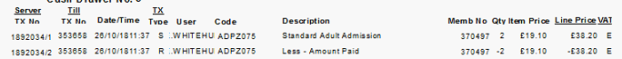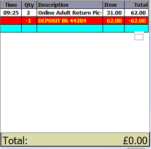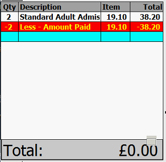 When the bookings are redeemed, the till will refund out the amount already paid under the same barcode with the ‘Description’ “Less – Amount Paid” for each of the booking lines. The footfall will happen at the time of completion and any tickets will print.