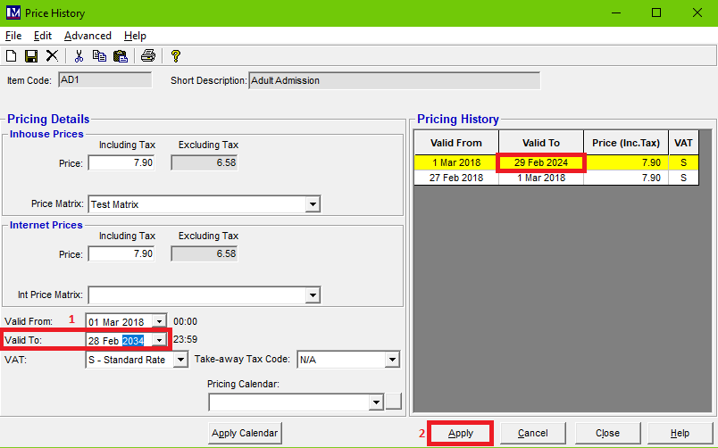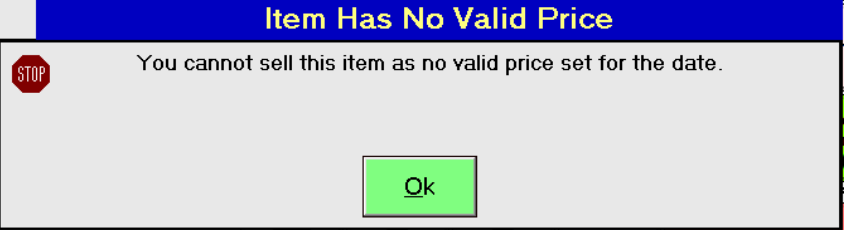 - Within the Price History screen, make sure there is a valid price showing for today, or the date you are trying to sell this item for. We recommend adding 10 years on most PLU's to reduce how common this issue occurs.