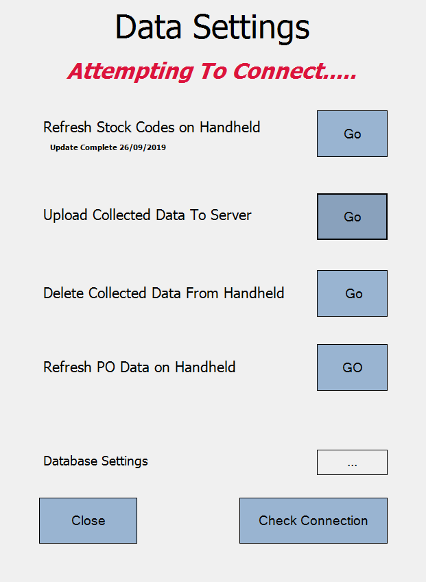 You must wait until you see the ‘Update Complete’ message (under ‘Refresh Stock Codes on Handheld’ text).
