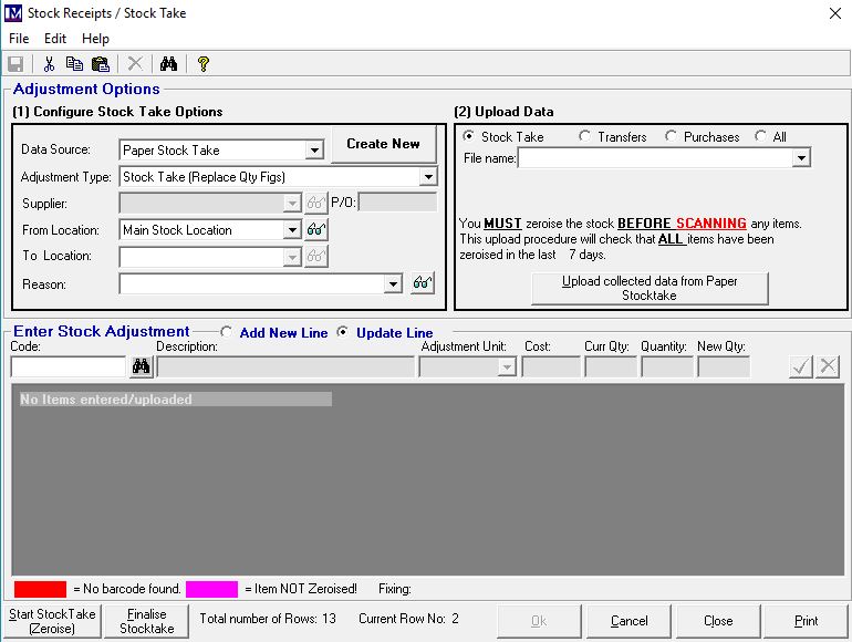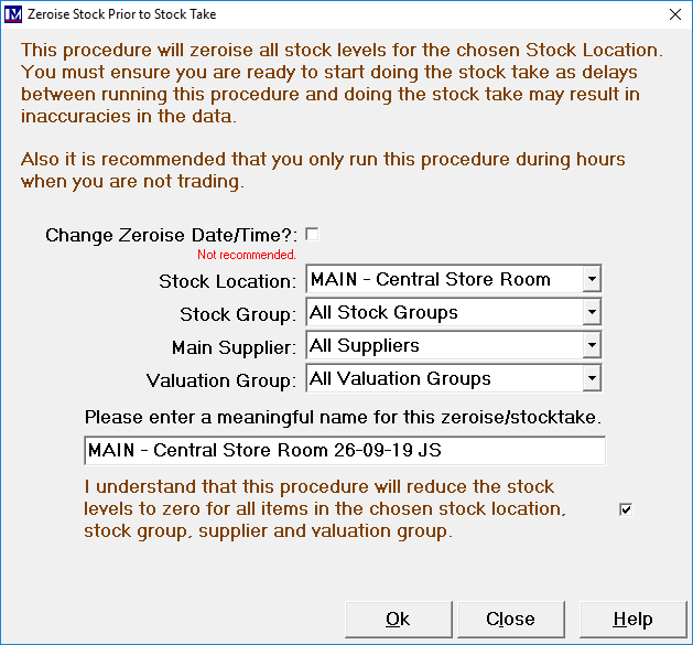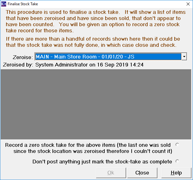 In the box under the text ‘Please enter a meaningful name for this zeroise/stock take’, it is recommended to include information on what was counted, such as the count date and the name / initials of the person responsible. For example, you may enter the for this zeroise / stocktake as Main Store 01/01/20 John Smith, as doing this will enable you to find this stocktake zeroise more easily later for reporting / auditing purposes.