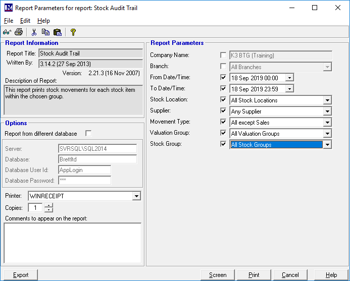 The parameters that can be selected when running this report are shown below.