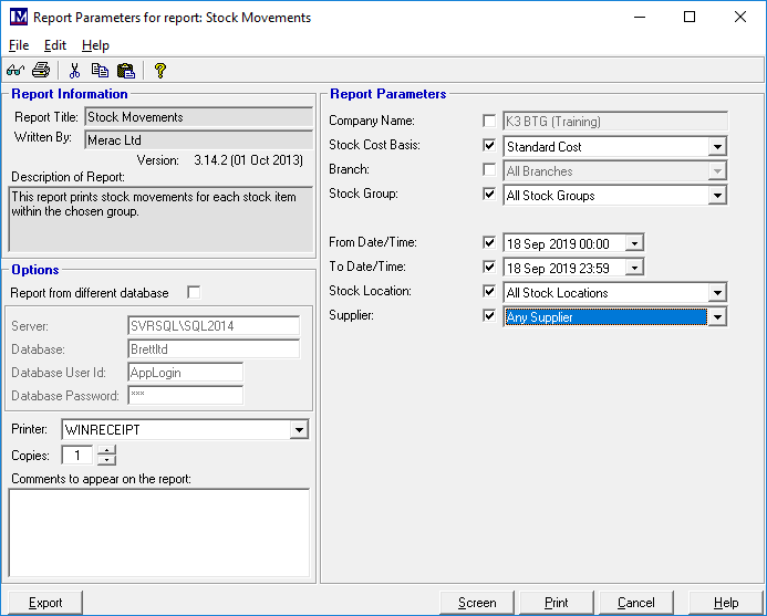 If you still cannot see the above reports, or you have issues when running these reports then please log a ticket with our Support Team detailing the issue, the name of the reports and the username you are logging on to Merac with and they will be able to assist. If there are any error messages, please include those in the support ticket detailing which report the error message was for and ideally a screenshot of the report parameters selected (like the above screenshot example)