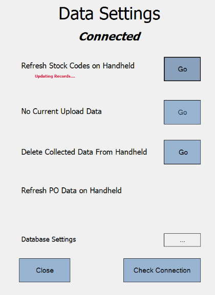 You will then see the message ‘Updating Records....’ (under Refresh Stock Codes on Handheld’ text).
