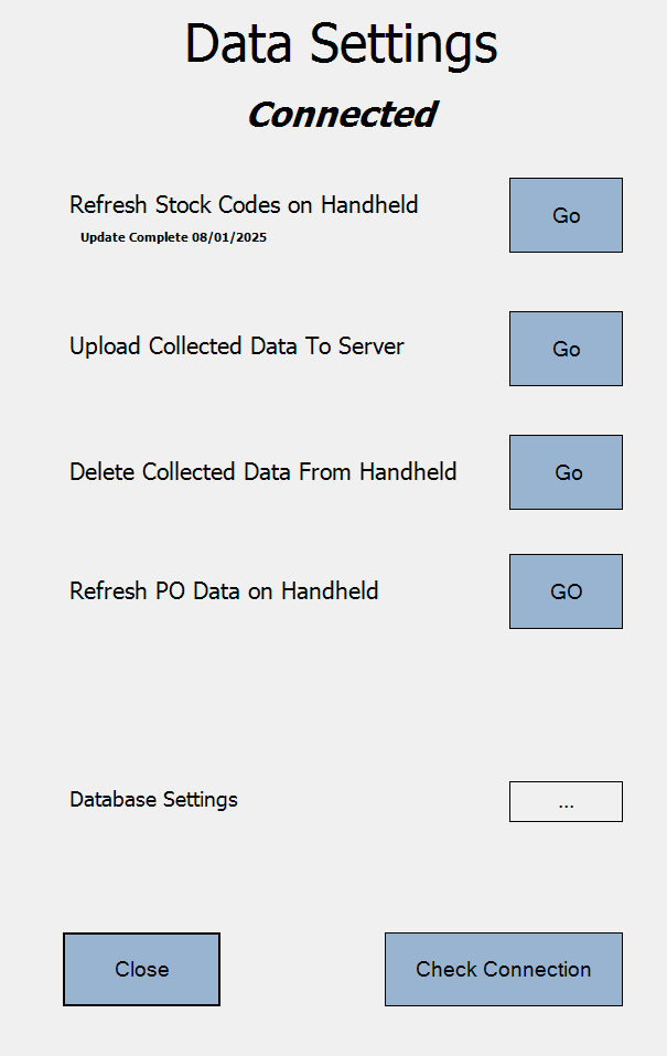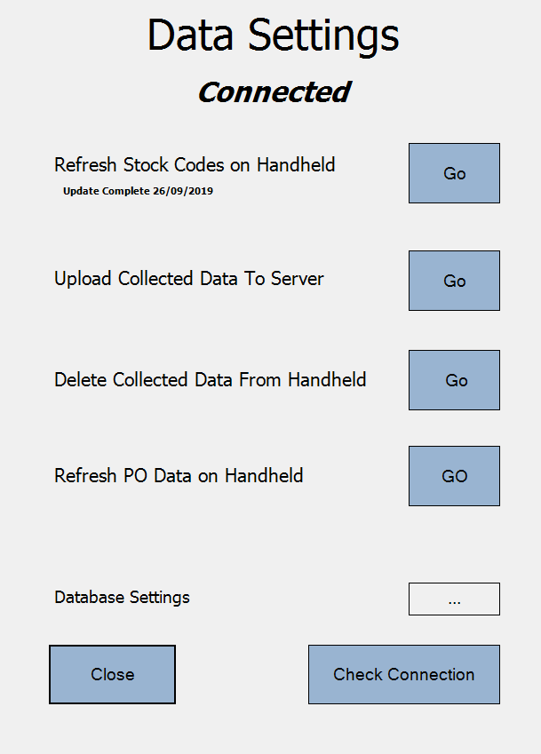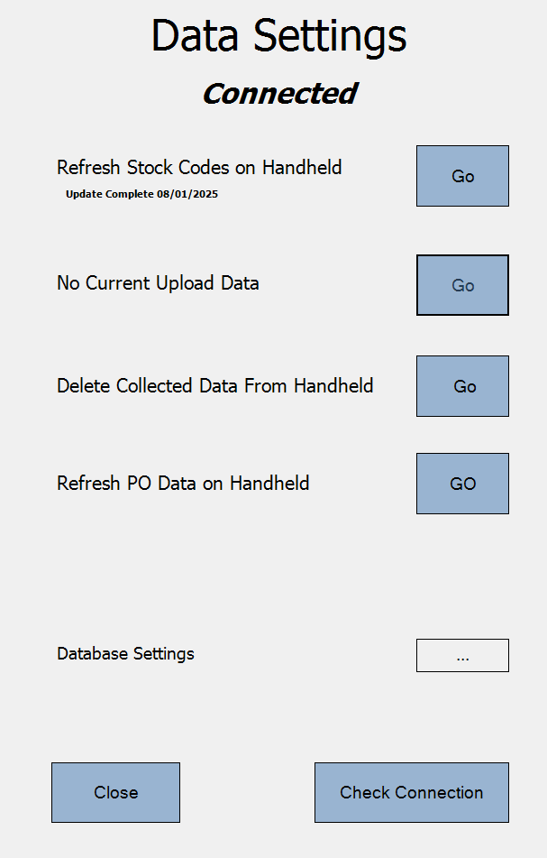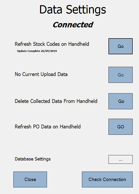 On the below screen touch the ‘Go’ button that is located to the right of ‘Refresh Stock Codes’.