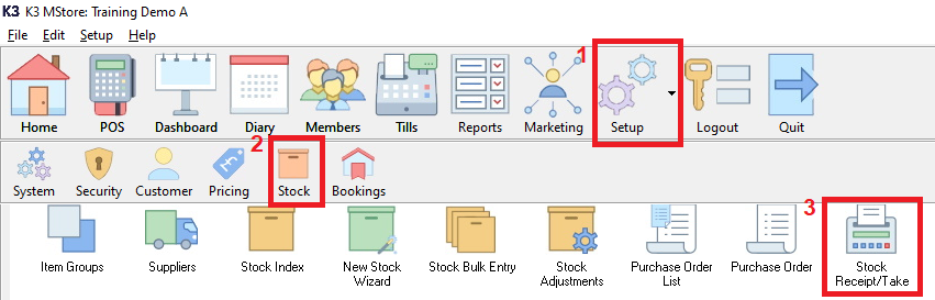 1. ‘Setup’ then 2. ‘Stock’ then 3. double click the ‘Stock Receipt/Take’ button.