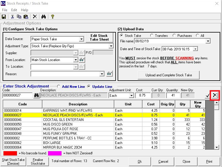 Now click on the ‘X’ button and this item (and any count for it) will be deleted from the stocktake.