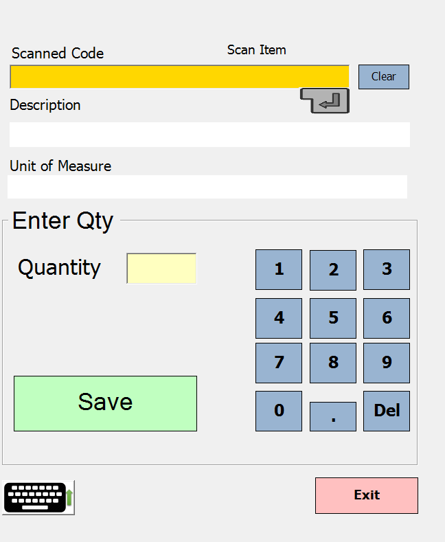 Please note if there is no item barcode or the barcode will not scan, the pop-up keyboard can be used to enter the code. To access the pop-up keyboard keyboard, click on the keyboard icon in the bottom left corner of the above screen. Use this pop up keyboard to type in the item code, then press the enter key on this keyboard to find the item.
