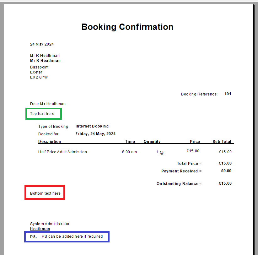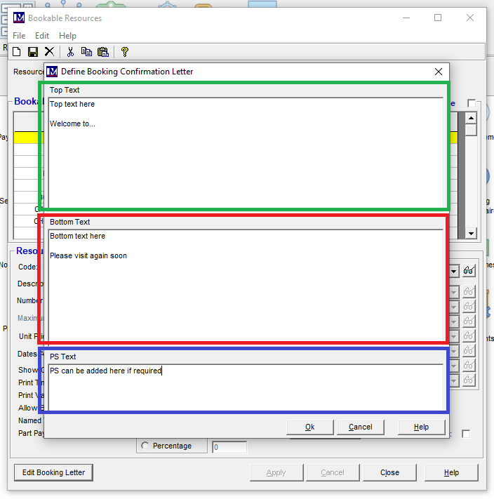 Modifying the top and bottom text for Booking Confirmation The booking confirmation contains three merge fields that can be modified within back office. Browse to 'Bookable Resources' Select 'Edit Booking Template'