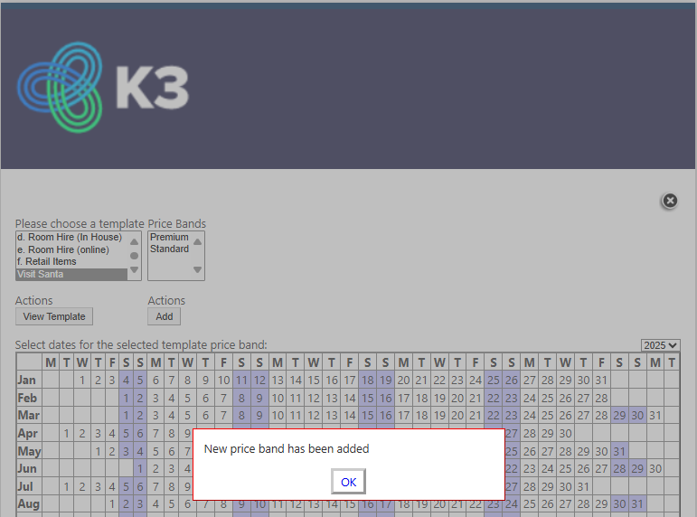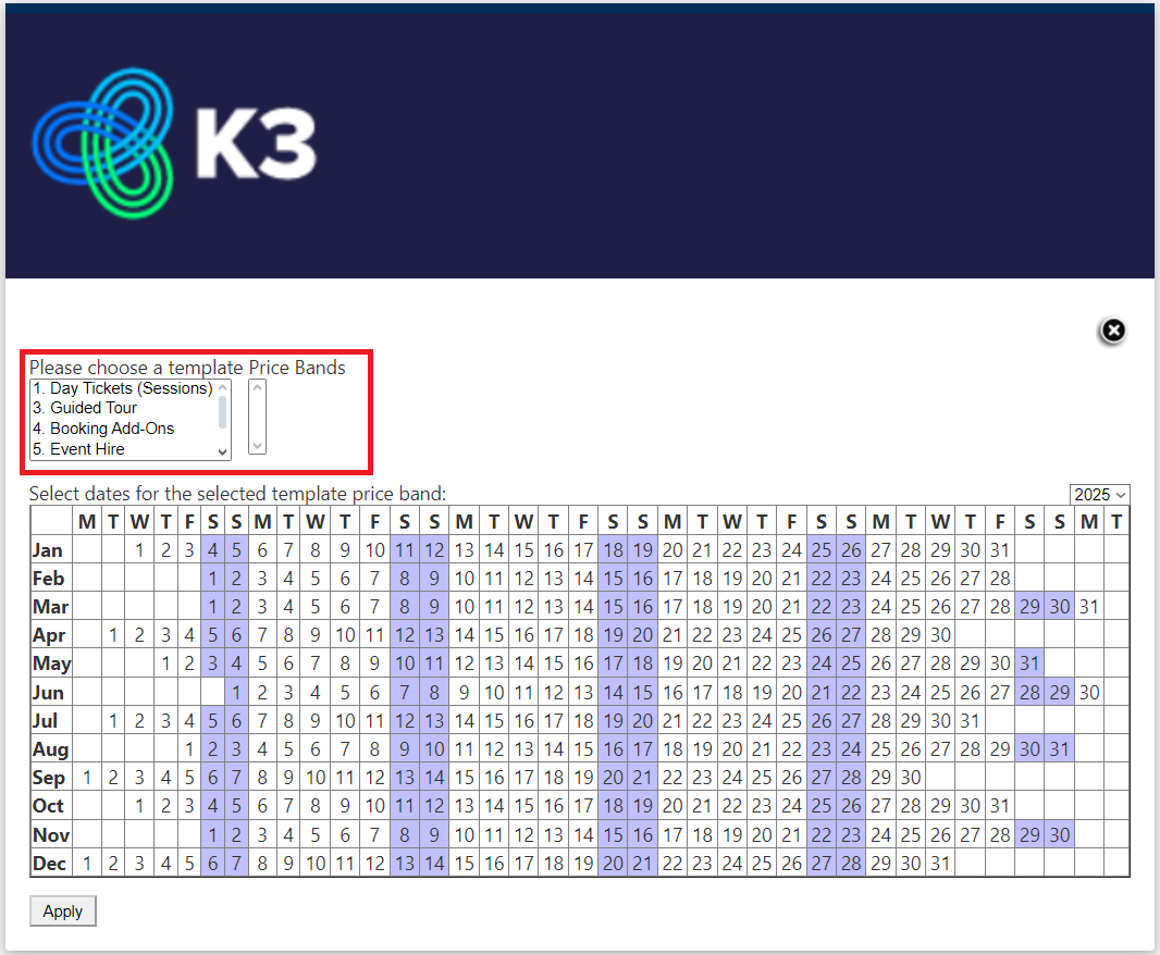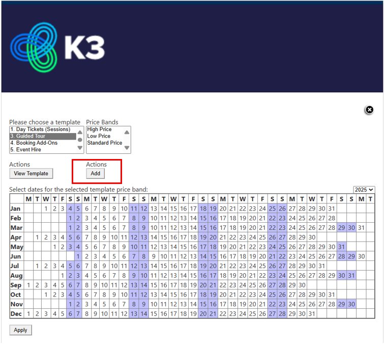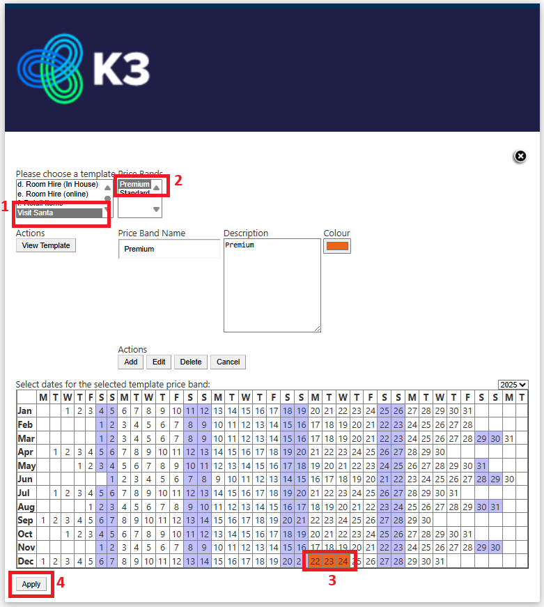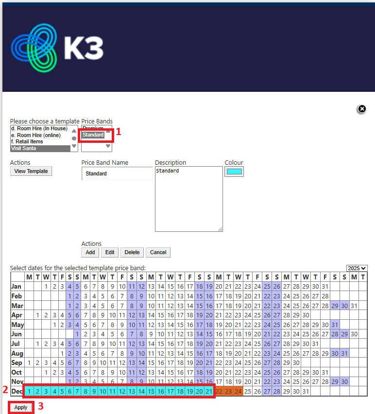 Now you need to apply the ‘Price Band’ colours to the required calendar dates for a specific template.
