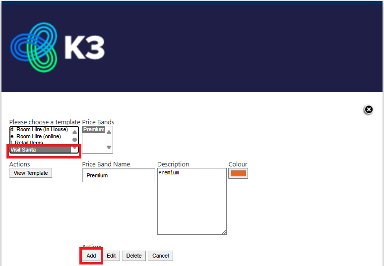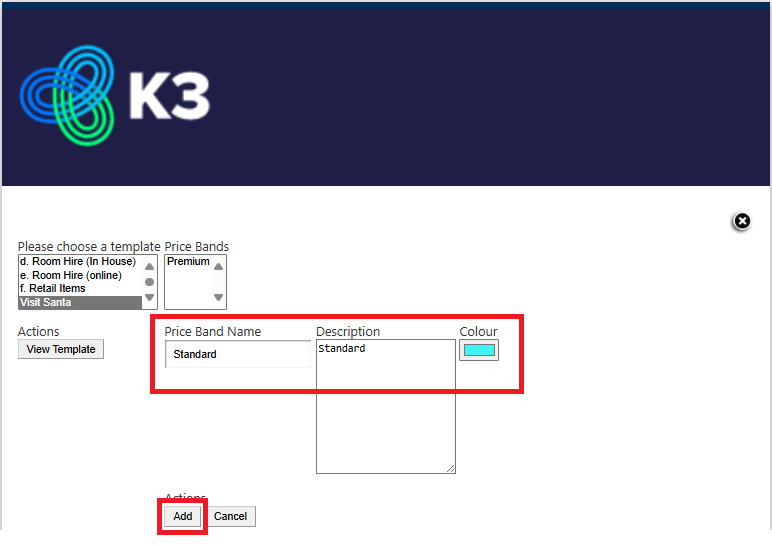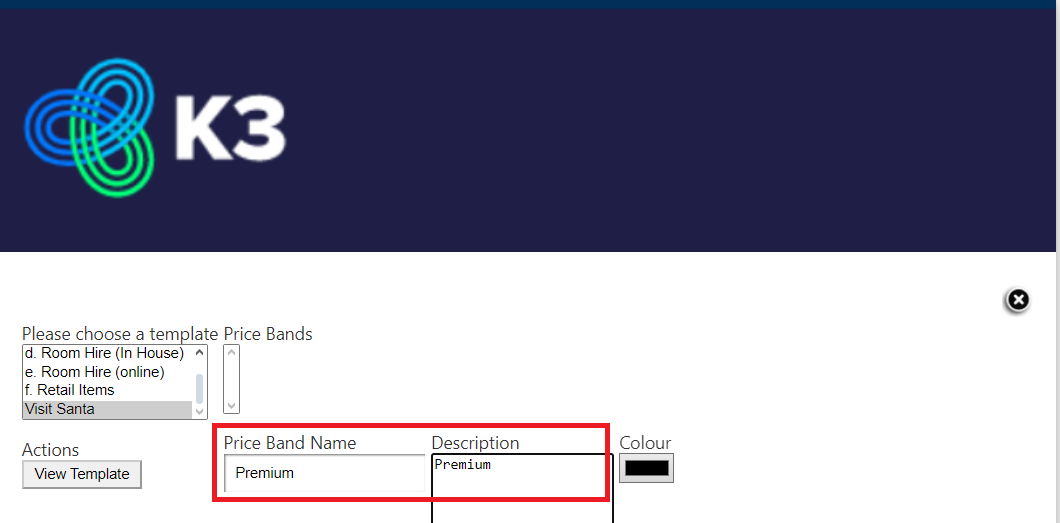 Repeat the process to enter the ‘Price Band Name’, ‘Description’ and to select the ‘Colour’ as before.