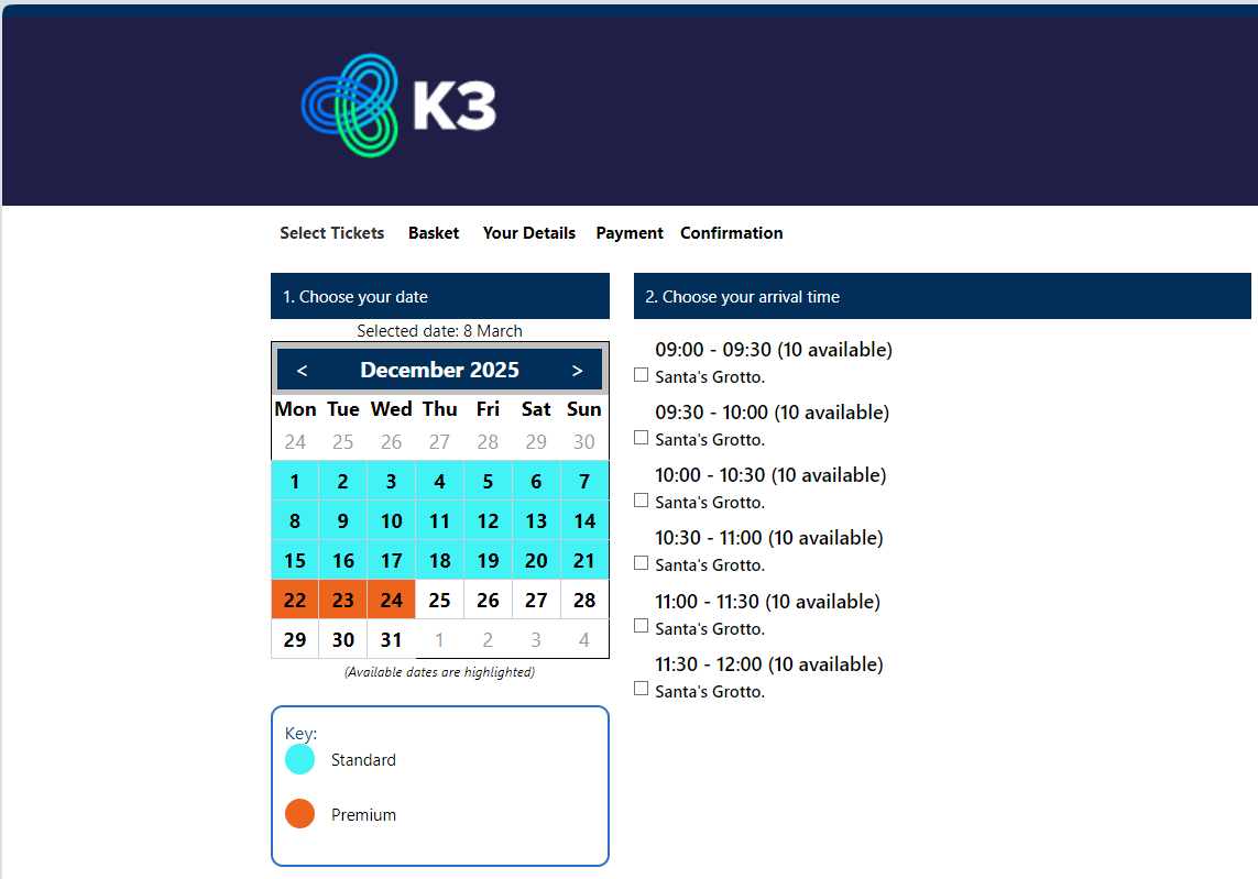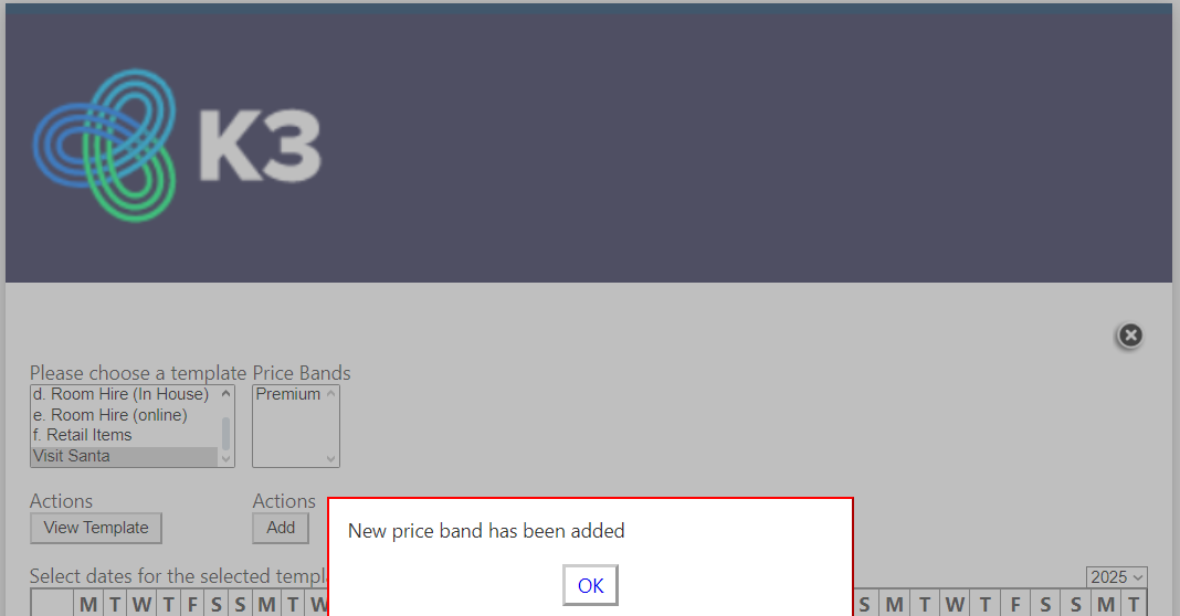 Online ‘Price Bands’ are a simple way of assigning colours to specific days or date ranges on the calendar (date selector) used on any of your online booking templates. The aim is to provide a colourised calendar, with a ‘Key’, in order to improve the customer user experience when making an online booking. This is most usually used to indicate where ticket prices change on specified days / date ranges, e.g. green coloured dates may represent ‘Standard Prices and red coloured dates represent ‘Premium Prices’. Where these are required, ‘Price Bands’ must be set up for each ‘Booking Template’ they are needed on. For each ‘Booking Template’, you can create the required ‘Price Band’ names and colours, then assign them to the calendar used for that specific ‘Booking Template’. Please note the system also automatically generates a ‘Key’ for you to show your customers what each of these colours represents.