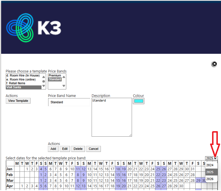 Check for each date in each year the ‘Price Bands’ were set up on and that the colours and ‘Key’ are showing correctly.