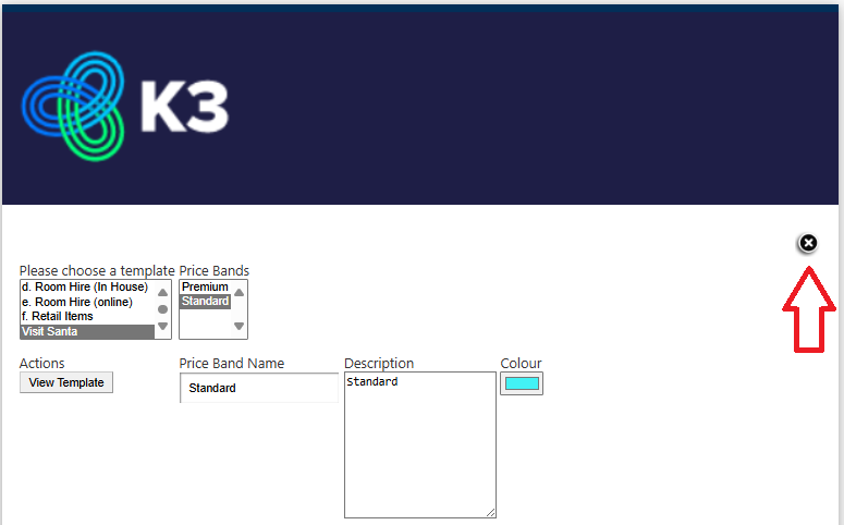 If other ‘Booking Templates’ need price band colours creating and applying, repeat the process as required for each specific ‘Booking Template’ as detailed in the previous pages. Once you have finished, click on the close button where shown.