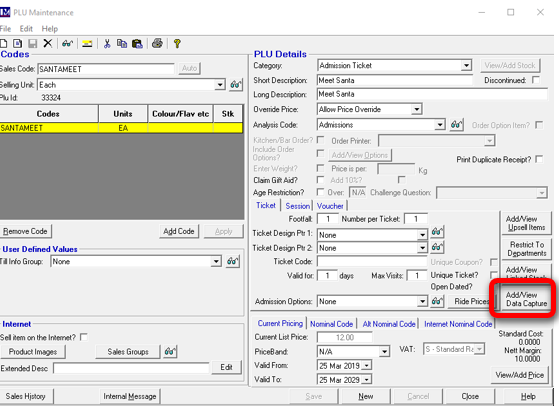 When selling a PLU or when booking a specific ‘Bookable Resource’, data capture can be used to record additional information that may be required. This could be information such as the nationality of anyone buying an admission ticket at the till, or the age of a child for a ‘Visit Santa’ booking made online.