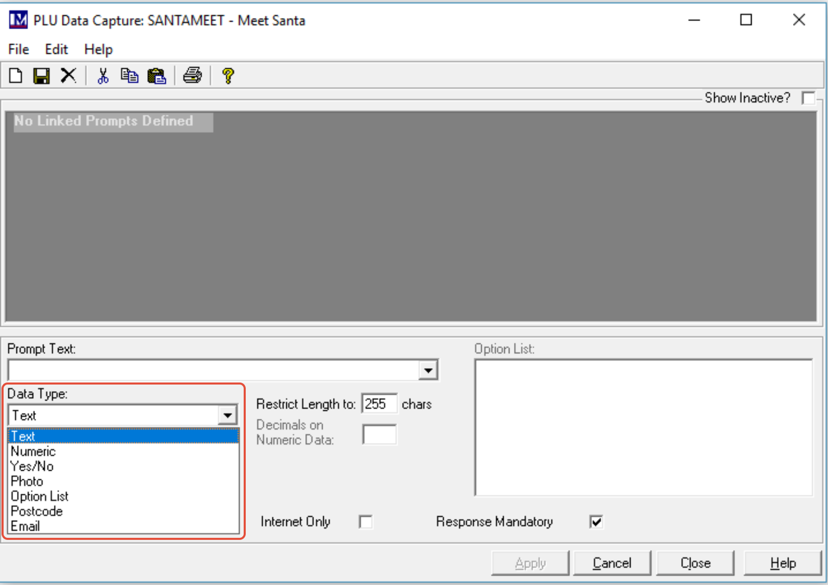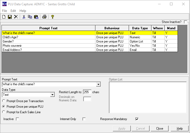 This option can inactivate the specific data capture question. This question then will then not show in the top half of the above screen, unless the tick box marked ‘Show Inactive?’ is ticked (by clicking the box).
