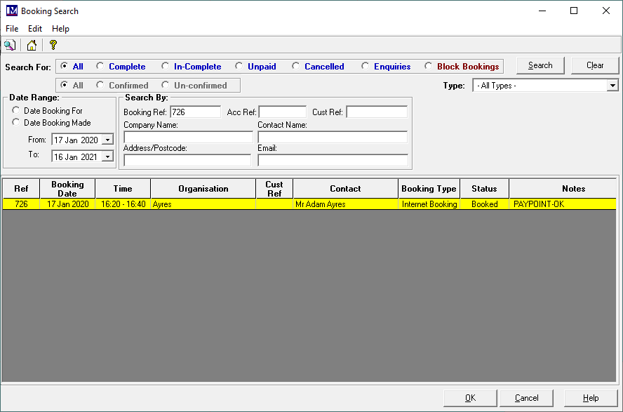 Double click any booking that is found (in the bottom half of the screen) to open the booking record.