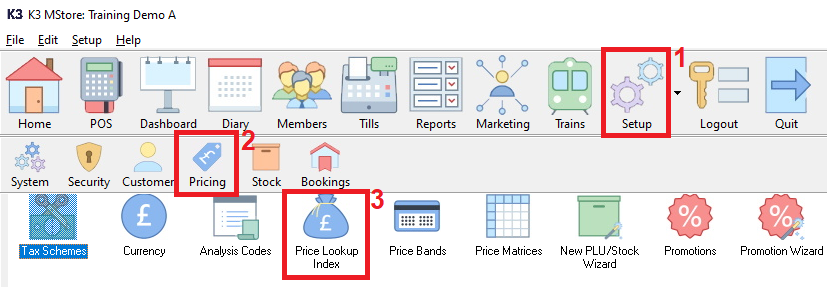 1. click the ‘Setup’ icon. 2. click the ‘Pricing’ icon. 3 double click the ‘Price Lookup Index’ icon.