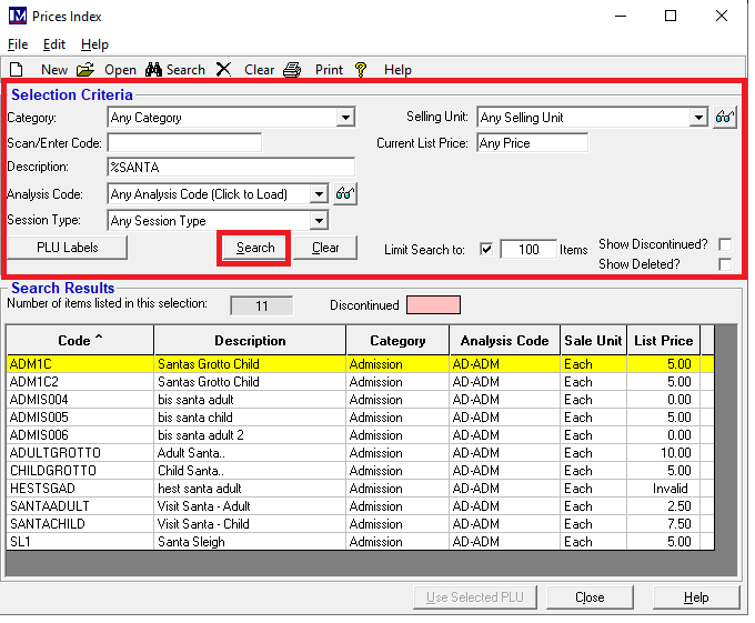 Find the required PLU using the ‘Prices Index’ in the usual way by entering the search criteria and click 'Search'.