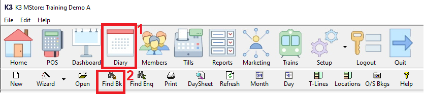 The easiest way to get view a booking is by 1. clicking 'Diary' then 2. click 'Find Bk'.