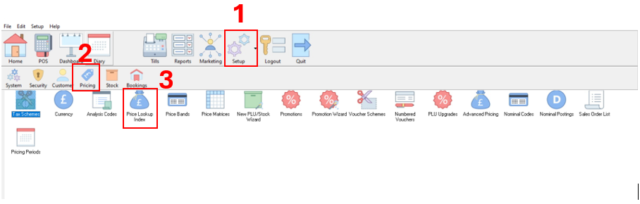 To do this 1. Click on ‘Setup’, 2. click ‘Pricing’, 3. double click on ‘Price Lookup Index’.