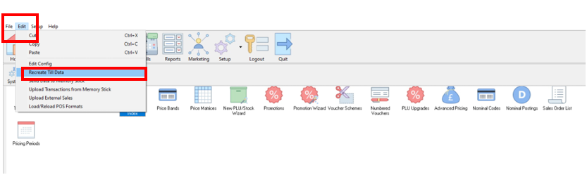 This is done in the usual way, which is: Click on 1. ‘Edit’ then 2. ‘Recreate Till Data’