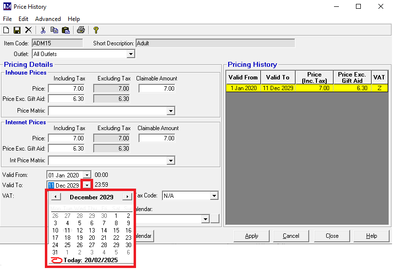 Before changing the price, the date that the current price ends on must be set correctly, as overlapping the end and start dates causes problems and must be avoided! To do this, click on the down arrow next to ‘Valid To’, then the calendar to select an end date for the current price.