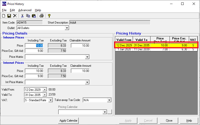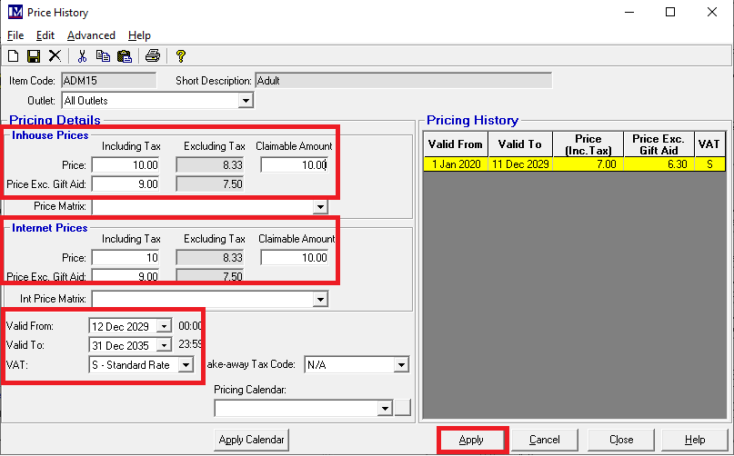 When the new price, dates and VAT rate have been set as required, click on ‘Apply’.